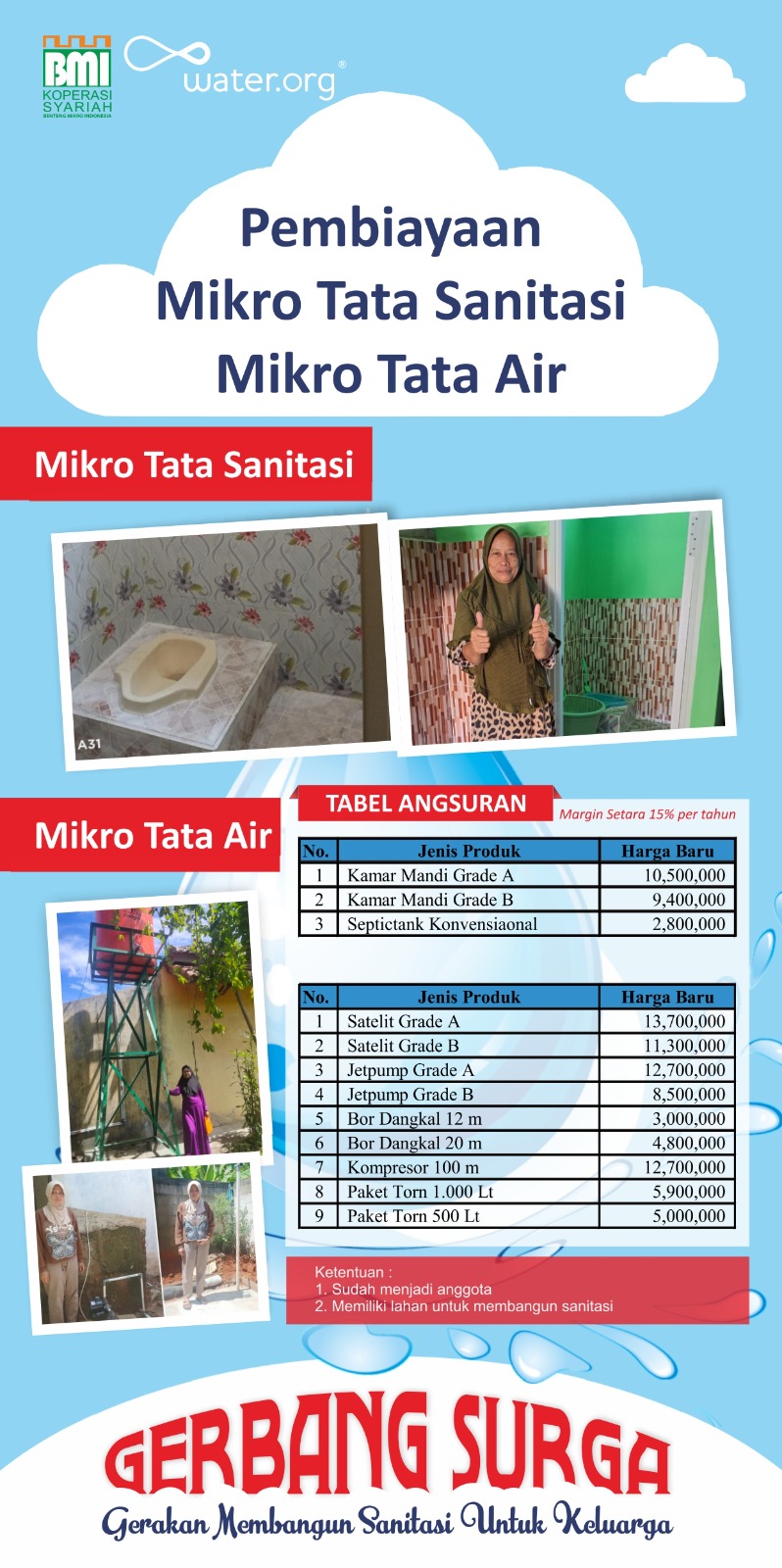 Diperuntukkan bagi anggota yang ingin memiliki fasilitas sanitasi sehat dengan nilai pembiayaan maksimal sebesar Rp15.000.000,-, untuk anggota baru dapat langsung mengajukan pembiayaan dengan terlebih dahulu dilakukan Appraisal dan Uji Kelayakan untuk mengukur kemampuan membayar angsuran dan aqad yang digunakan Istishna'.