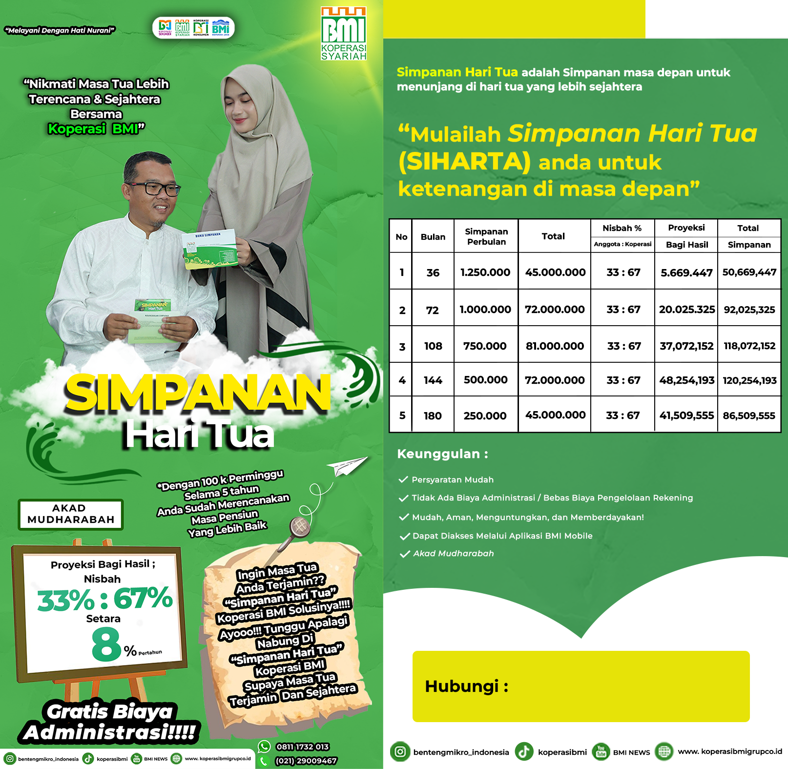 Simpanan Hari Tua (siharta) adalah fasilitas simpanan berencana anggota untuk persiapan masa tua yang sejahtera. Akad mudharabah dengan proyeksiBagi Hasil Simpanan setara 10% pertahun. Simpanan ini Tidak dikenakan biaya administrasi bulanan.