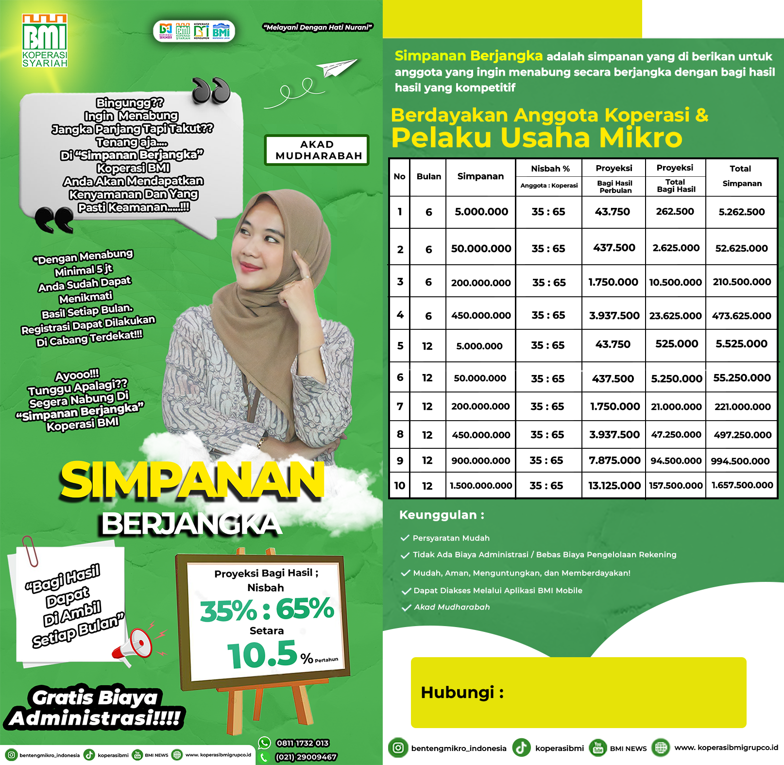 Simpanan Berjangka adalah simpanan anggota koperasi yang lama penyimpanannya memiliki jangka waktu tertentu dengan pola bagi hasil. Minimal Simpanan sebesar Rp5.000.000,- dengan waktu penyimpanan minimal enam bulan. Ketentuan pada simpanan berjangka adalah sebagai berikut : Sudah menjadi anggota koperasi (pelunasan simpanan pokok); Membayar simpanan wajib secara rutin sesuai ketentuan yang berlaku; Akad yang digunakan adalah Simpanan mudharabah (suatu aqad penyerahan modal dari pemilik modal (shahibul maal) yakni pemilik modal tidak terlibat dalam manajemen usaha dengan keuntungan dibagi berdasarkan nisbah yang disepakati bersama (bagi hasil setara 10,5% pertahun). Simpanan Berjangka yang dicairkan oleh anggota sebelum jatuh tempo sebagaimana yang diperjanjikan, maka koperasi akan mengenakan penalti 10% dari jumlah Simpanan. Tidak dikenakan biaya administrasi bulanan.