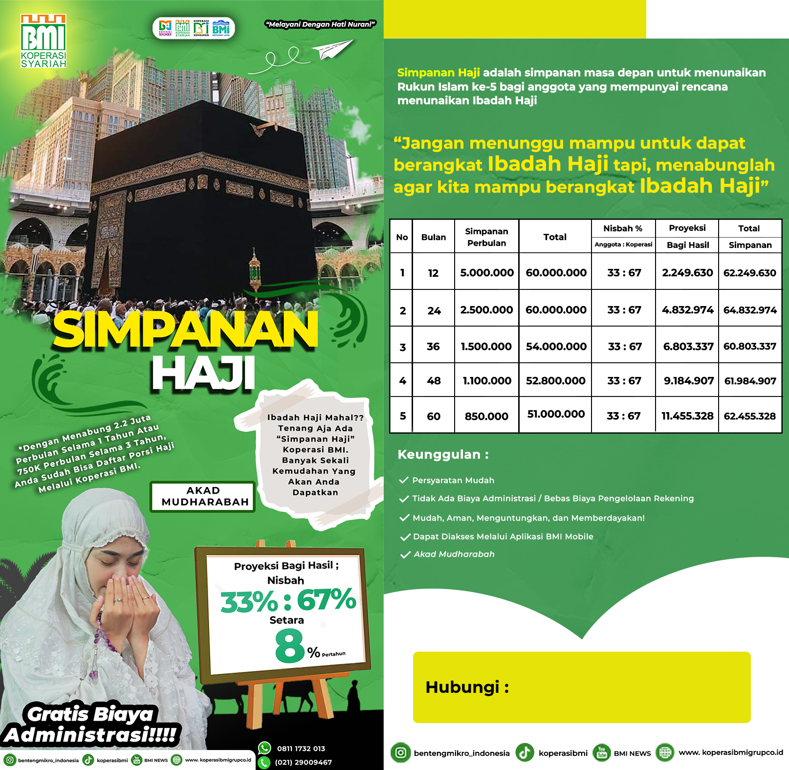 Diperuntukkan bagi anggota yang ingin melaksanakan haji, dengan ketentuan lamanya penyimpanan sampai batas waktu pemberangkatan, sesuai nominal paket yang diambil dengan akad mudharabah (bagi hasil setara 10% pertahun dan tidak boleh diambil selama saldo belum mencukupi). Simpanan ini Tidak dikenakan biaya administrasi bulanan.