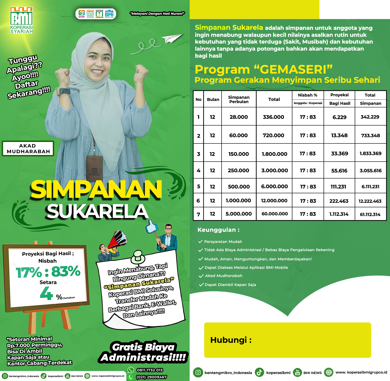Dalam upaya membudayakan Simpanan Sukarela bagi anggota, ditetapkan sebuah program yang diberi nama GEMA SERI(Gerakan Menyimpan Seribu Sehari). Maka diharapkan semua anggota mempraktekannya sebagai upaya kemandirian anggota dan koperasi Ketentuan pada simpanan sukarela adalah sebagai berikut : Buku Gratis dan bisa diambil pada rembug pusat dan setiap hari kerja; Simpanan pertama minimal Rp5.000,-, berikutnya minimal Rp500,- ; Setiap anggota wajib memiliki saldo simpanan sukarela sebesar 2X nilai angsuran pembiayaan terakhir (disetorkan pada saat pencairan); Nilai bagi hasil sebagai jasa wadiah (setara 8% pertahun). Tidak dikenakan biaya administrasi bulanan. Akad yang digunakan adalah mudharabah. Manfaat simpanan sukarelabagi Anggota : Membayar angsuran bilamana sedang tidak memiliki uang; Kebutuhan jangka panjang (keperluan lebaran, bersalin, dll); Keperluan mendadak (anak sakit, menjenguk saudara, dll).