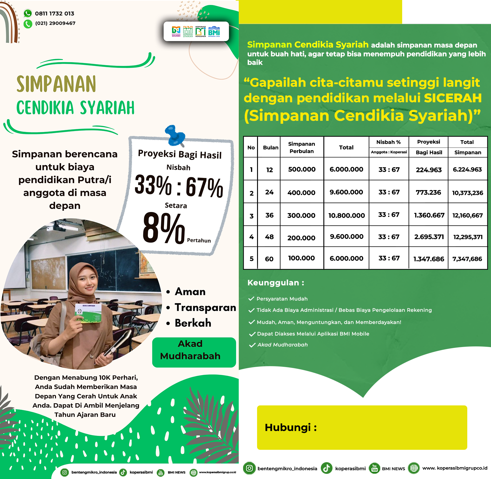 Diperuntukkan bagi anggota yang ingin memberikan pendidikan terbaik kepada anaknya, minimal wajib belajar 12 tahun dan Akad yang digunakan adalah mudharabah. Mekanisme simpanan bersifat tetap sesuai jenjang pendidikan yang diambil. Simpanan ini Tidak dikenakan biaya administrasi bulanan.