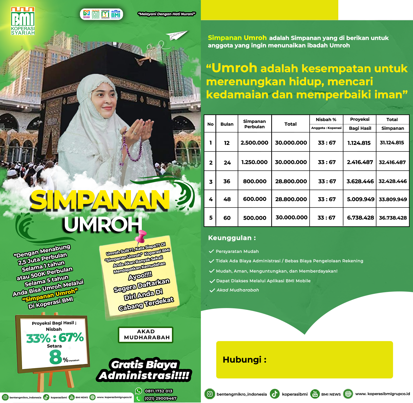 Diperuntukkan bagi anggota yang ingin melaksanakan umroh. Dengan ketentuan lamanya penyimpanan sampai batas waktu pemberangkatan, sesuai nominal paket yang diambil dengan akad mudharabah (bagi hasil setara 10% pertahun dan tidak boleh diambil selama saldo belum mencukupi). Simpanan ini Tidak dikenakan biaya administrasi bulanan.