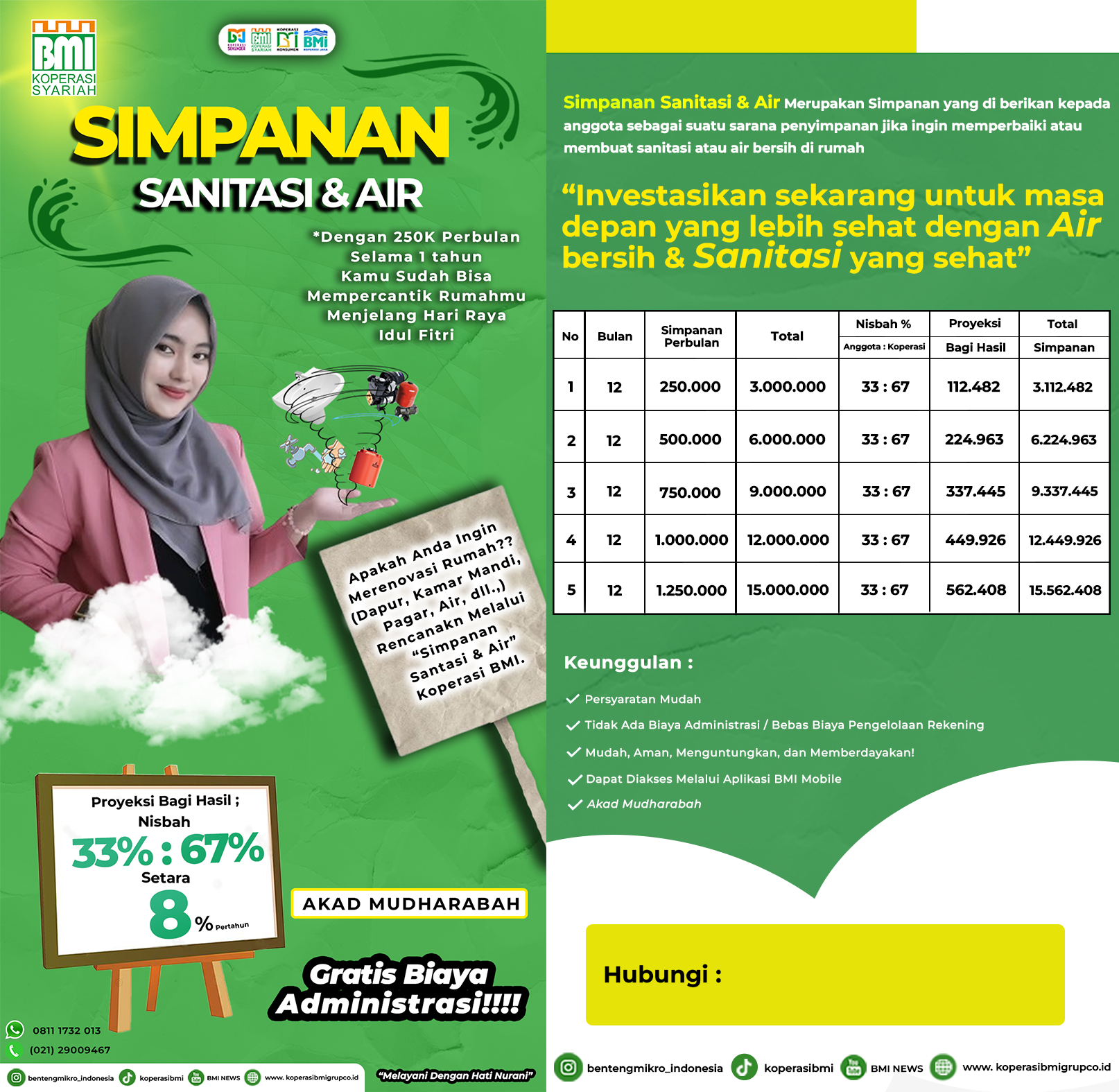 Diperuntukkan bagi anggota yang ingin memiliki fasilitas Sanitasi dan Air tanpa melalui tahapan pembiayaan dan atau untuk perbaikan atau peningkatan kualitas dengan akad mudharabah (bagi hasil setara 10% pertahun). Ketentuan lamanya penyimpanan sampai jumlah mencukupi untuk membangun sanitasi & air dan atau dengan saldo minimal 20% dari kebutuhan serta berlaku untuk masa keanggotaan < 1 tahun. Simpanan ini Tidak dikenakan biaya administrasi bulanan.